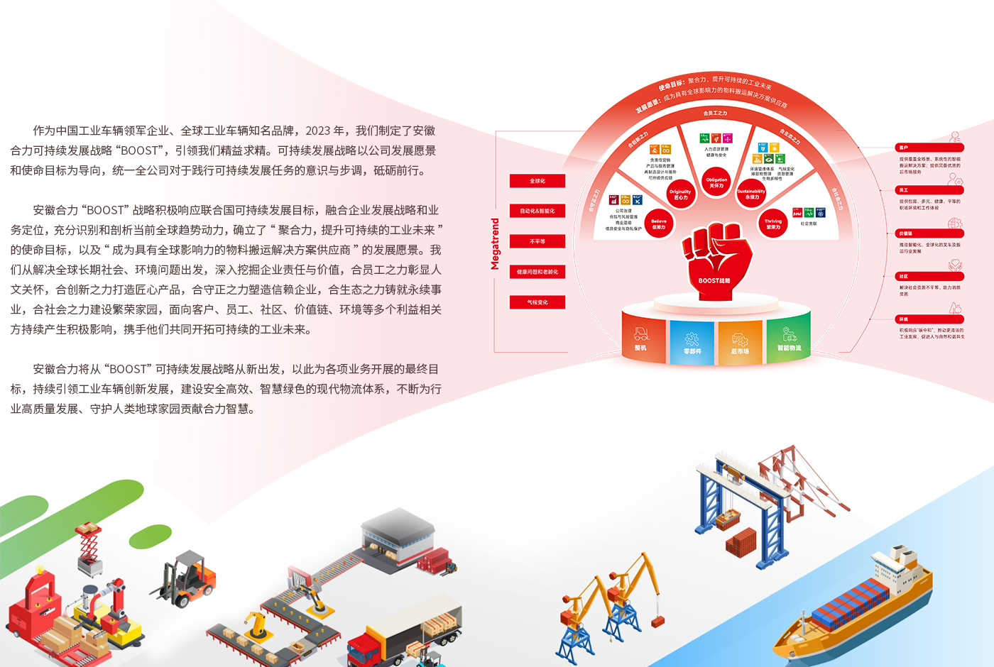合力叉車將秉持“世界五強(qiáng) 百年合力”的企業(yè)愿景,以“變革、創(chuàng)新、開放、合作”為動(dòng)力,致力于成為全球叉車專家及中國自動(dòng)化物流設(shè)備供應(yīng)商。